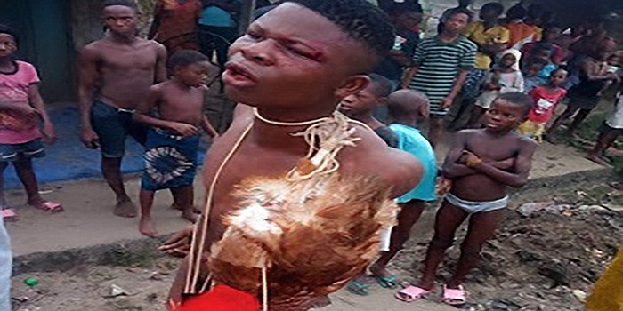 Here is what Nigerian vigilante justice looks like. This is Delta state, Nigeria. Basically this teen stole chickens, instead of my illiterate people taking the chickens away from him and hand him over to police for prosecution and a date in court, they abused the chickens and tie them on him beating him up then humiliating him by "parading" him. In most cases, he could have been killed after doused with gasoline.