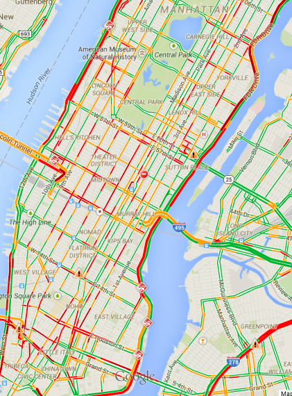 #HNNTraffic in #NYC right now. #Ferguson #shutitdown. Just look at the red portions of gridlock where the protesters may well be blocking.
